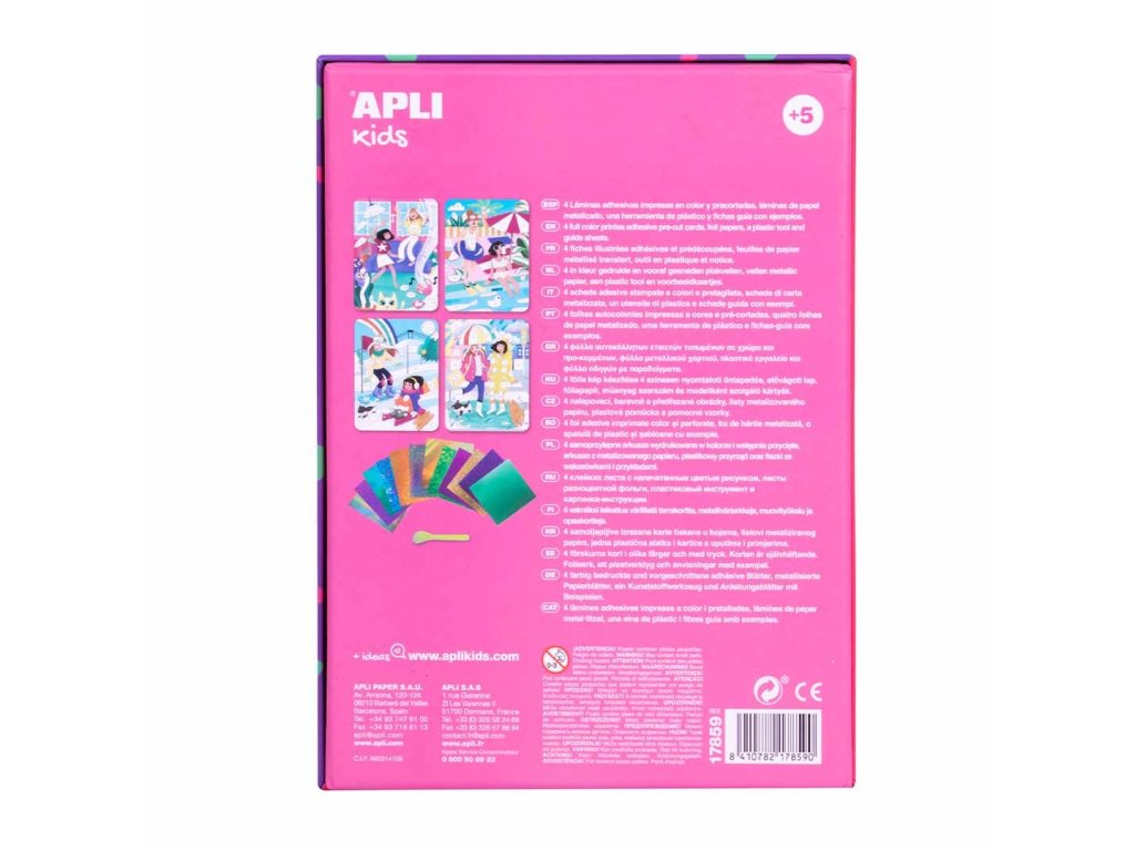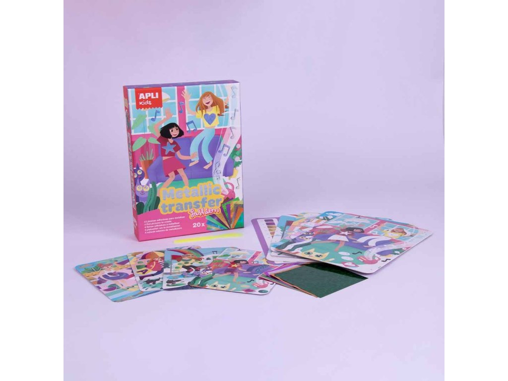 Metalický transfer Apli Móda je tvořivá sada pro vytváření kreseb s módními motivy. Děti pomocí této sady doplňují kresby na kartách pomocí listů přenosového metalického papíru různých barev. Prostřednictvím přiloženého plastového nástroje se odstraní nevybarvené části karet s obrázky. Vzniklá samolepicí ploška se pak "vybarví" pomocí přiložení metalického papíru.