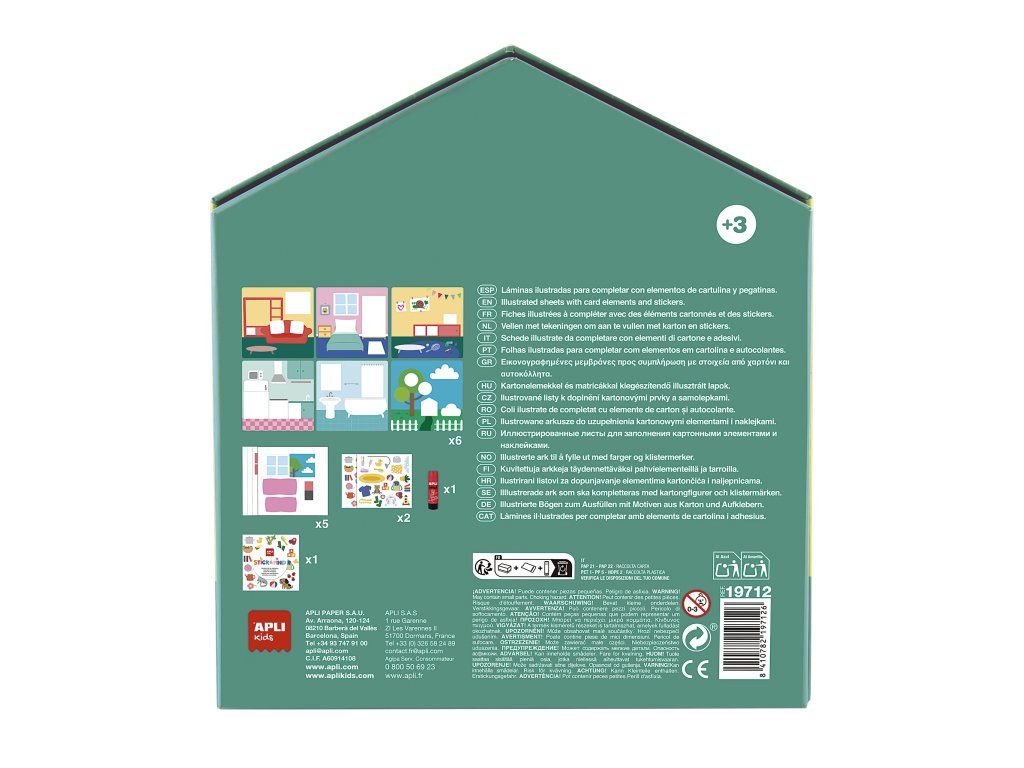 Obsahuje 6 ilustrovaných listů, 5 předem nastříhaných listů, 2 listy se samolepkami, 1 lepicí tyčinku o hmotnosti 20g a 1 knihu s pokyny a příklady, jak aktivitu provádět.