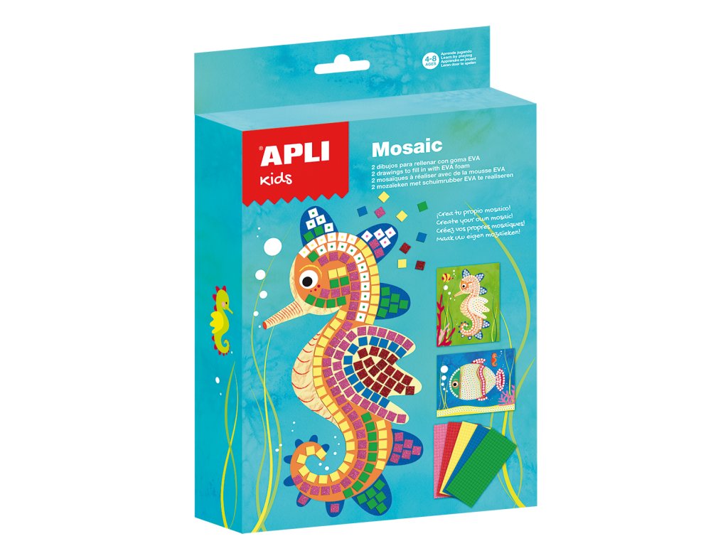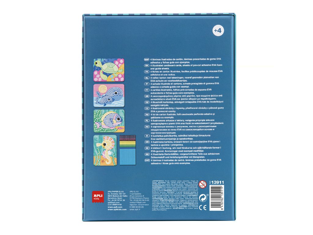 Produkt obsahuje předlohu, předem nařezané lepicí pěnové barevné čtverečky v barvách a 4obrázky: mořský koník a ryby.
