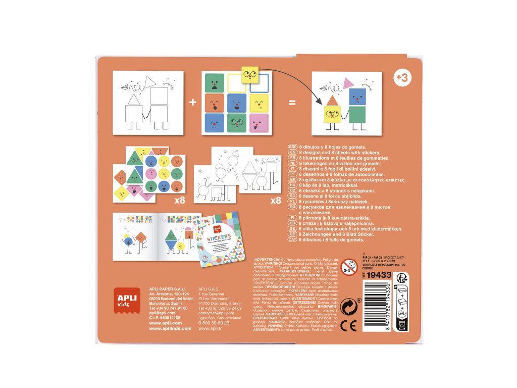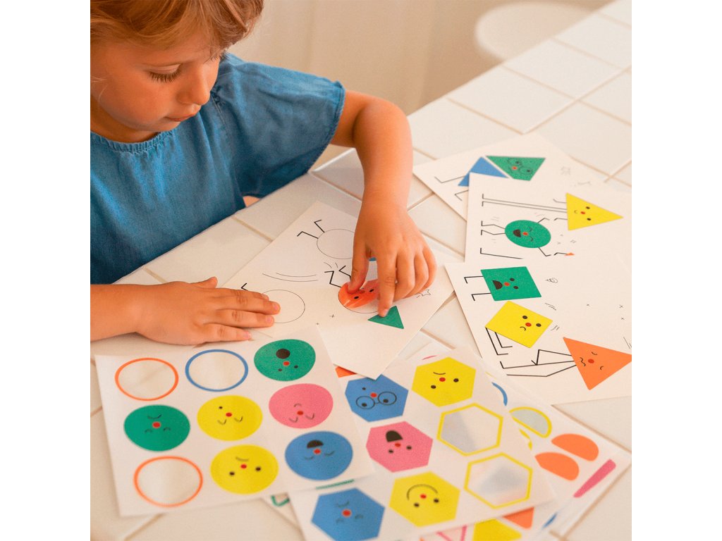 Sada obsahuje: 8 ilustrovaných listů, 8 listů odnímatelných samolepek a 1 brožuru s příklady, jak vyplnit různé vzory. Odnímatelné samolepky ve hře umožňují dítěti opravit, pokud udělá chybu.