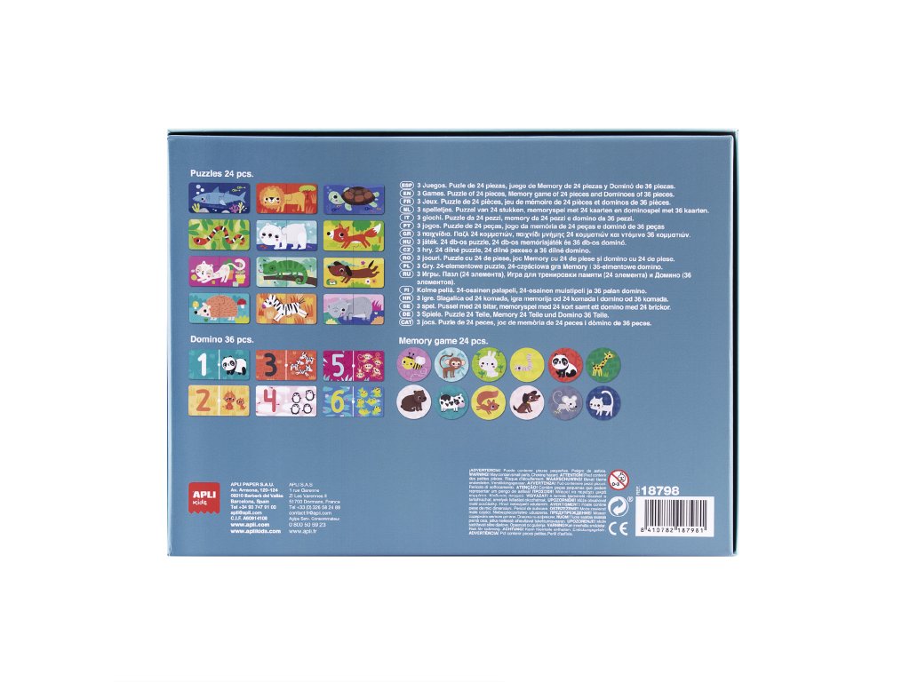 Zabavte děti na dlouhé hodiny jednou krabicí s třemi hrami o zvířátkách. Děti mohou nejdříve skládat puzzle, pak hrát pexeso nebo domino a rozvíjet své motorické i logické schopnosti a navíc se učit vyslovovat jména zvířátek a popisovat obrázky.