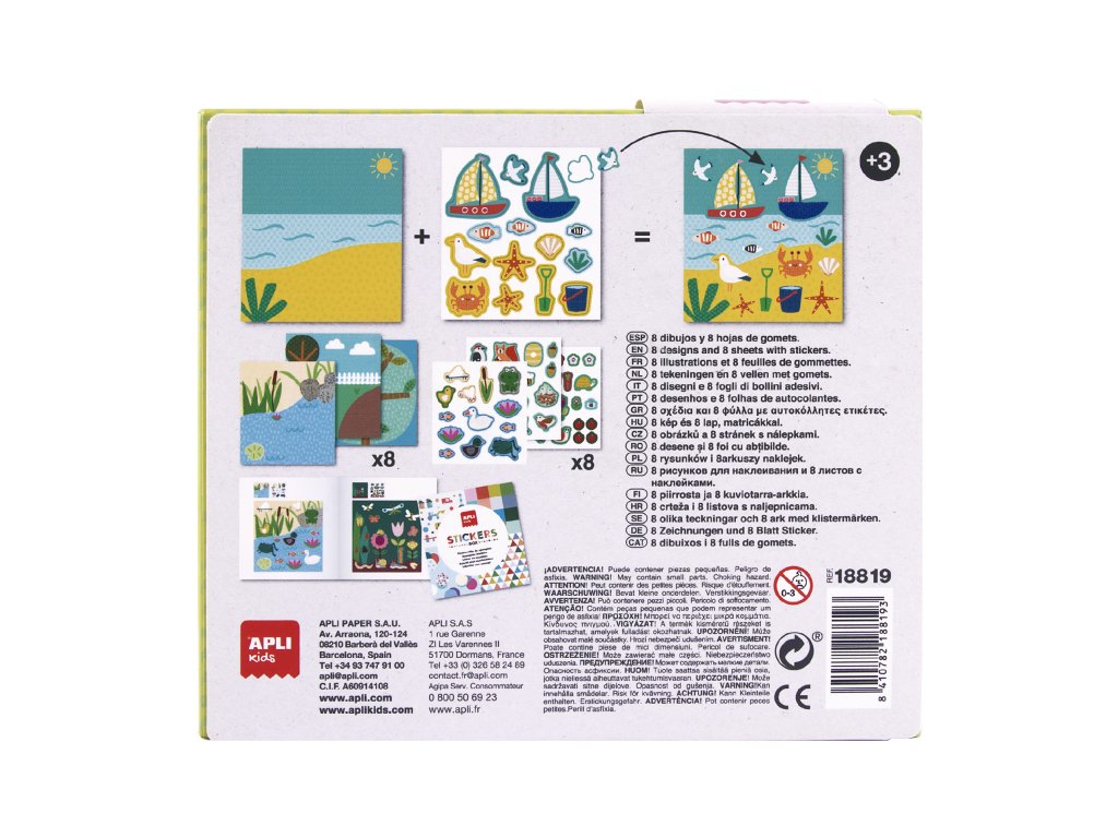 Sada obsahuje: 8 ilustrovaných listů o hmotnosti 200 g s matným povrchem pro vyplnění samolepkami, 8 listů snímatelných samolepek v různých barvách a průvodce s barevnými příklady. Odnímatelné gumičky ve hře umožňují dítěti opravit, pokud udělá chybu.