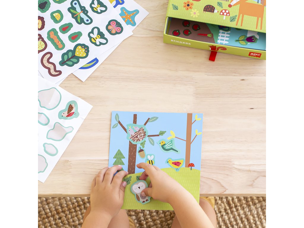 Užijte si s dětmi nekonečnou zábavu s nalepováním a vytvářením svého vlastního originálního lesa. Pomocí samolepek můžete hodiny a hodiny vytvářet obrázky lesa s jeho jedinečnou atmosférou. Skládejte s dětmi svoji lišky, houby, sovy a další lesní zvířátka a užívejte si objevování lesa a jejich obyvatel.