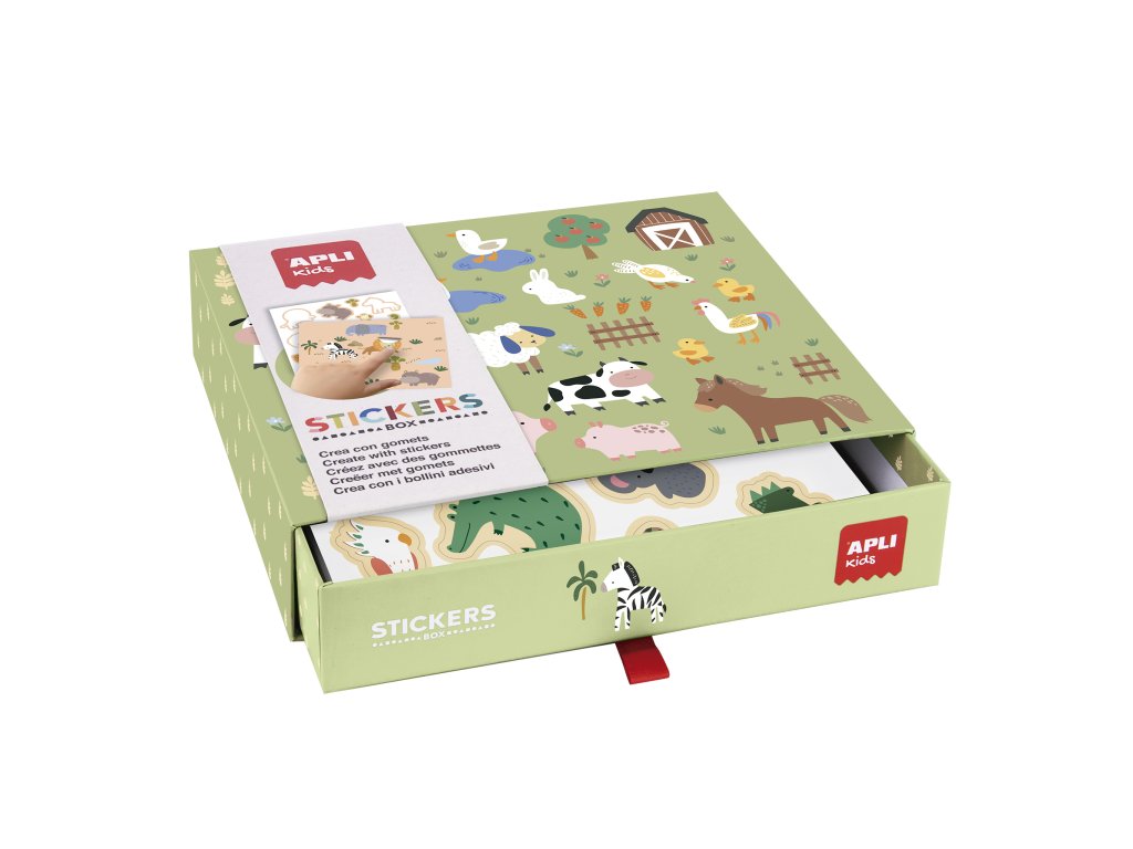 Sada samolepek s modelem Zvířata a jejich životním prostorem v kartonové krabici.