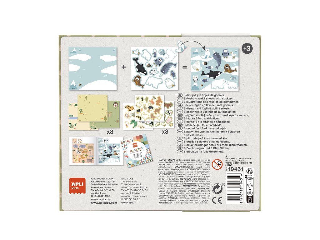 Sada obsahuje: 8 ilustrovaných listů, 8 listů odnímatelných samolepek a 1 brožuru s příklady, jak vyplnit různé vzory. Odnímatelné samolepky ve hře umožňují dítěti opravit, pokud udělá chybu.