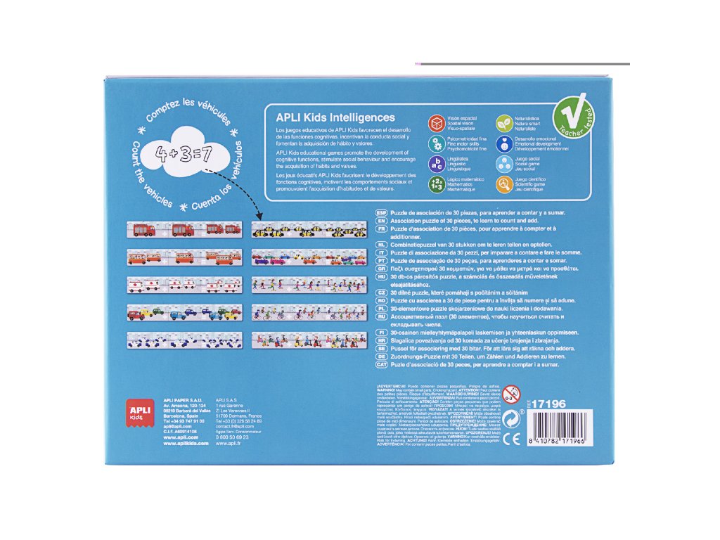 Děti by měly počítat vozidla na ulici a hledat části, které obsahují odpovídající součty. Robustní, bezpečné a snadno manipulovatelné díly do sebe dokonale zapadají a umožňují snadné umístění. Originální a didaktické puzzle, protože pomáhají dětem s počítáním zábavných vozidel, rozvíjí jemnou motoriku a zlepšuje koncentraci. Doporučeno pro děti od 5 let.