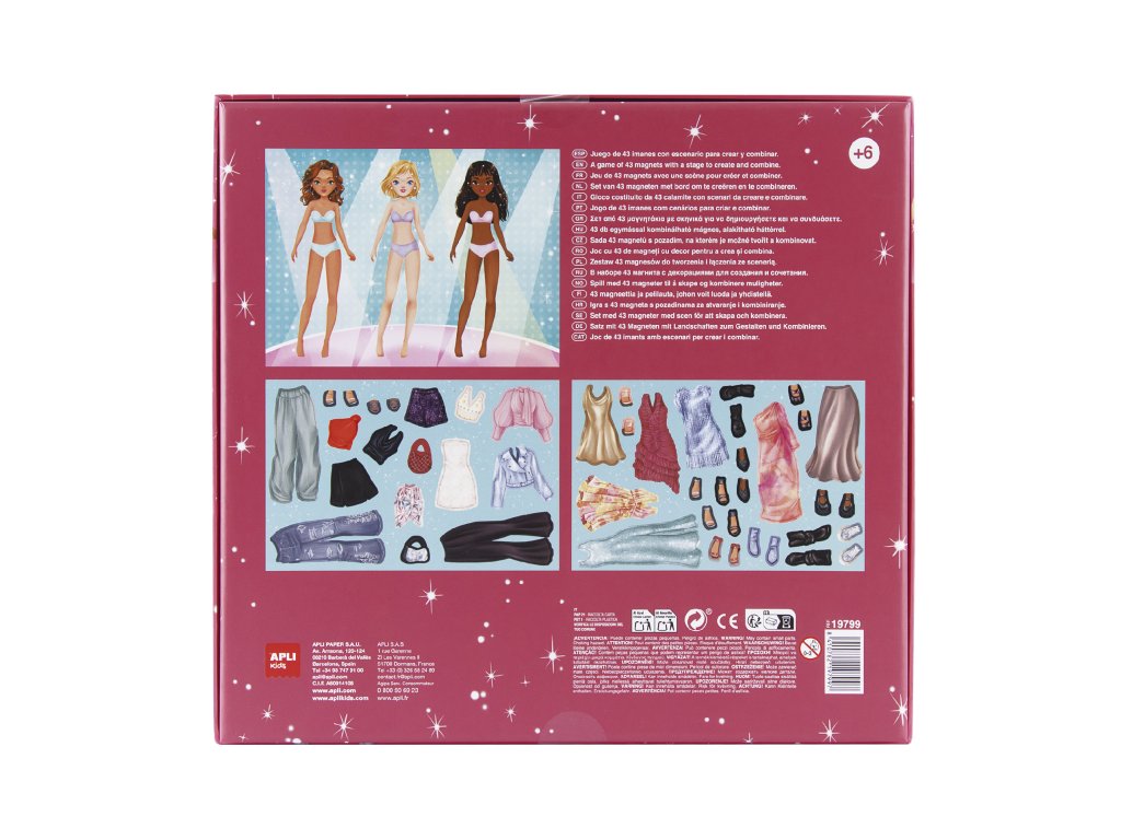 Sada obsahuje 1 magnetický stolek a 43 magnetů ve tvaru různých oděvů a doplňků s nejaktuálnějšími vzory.