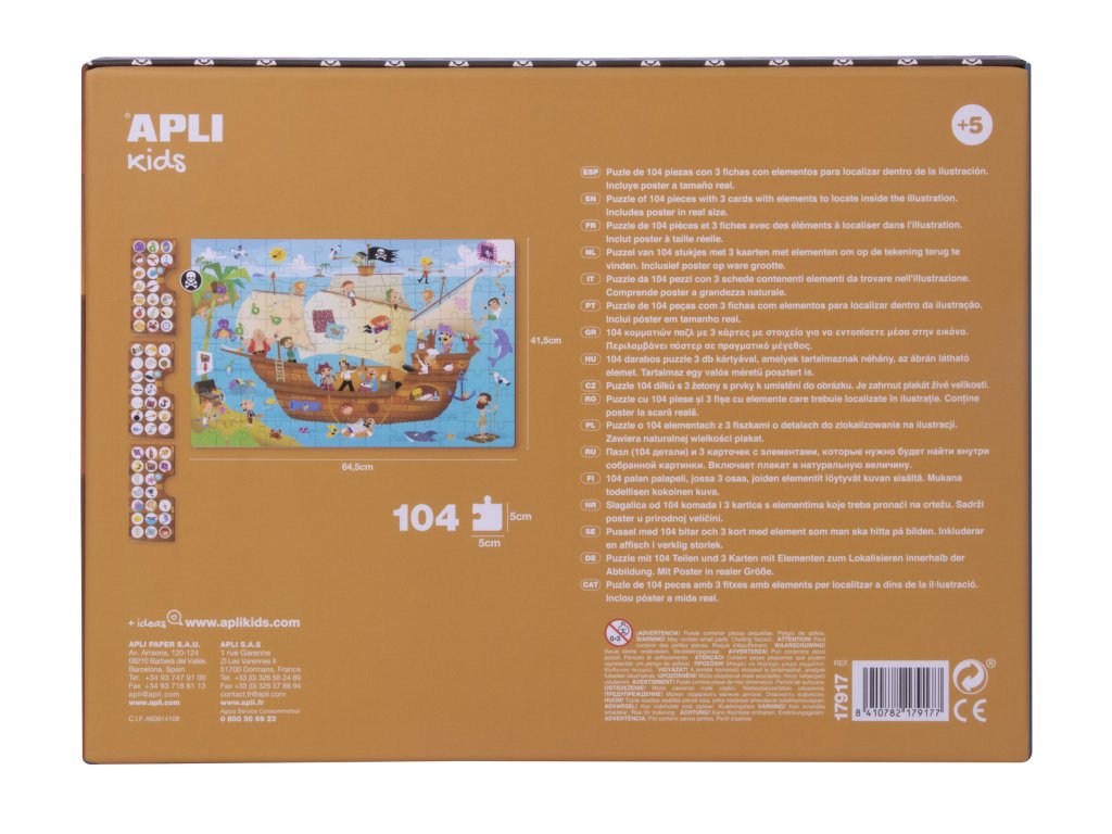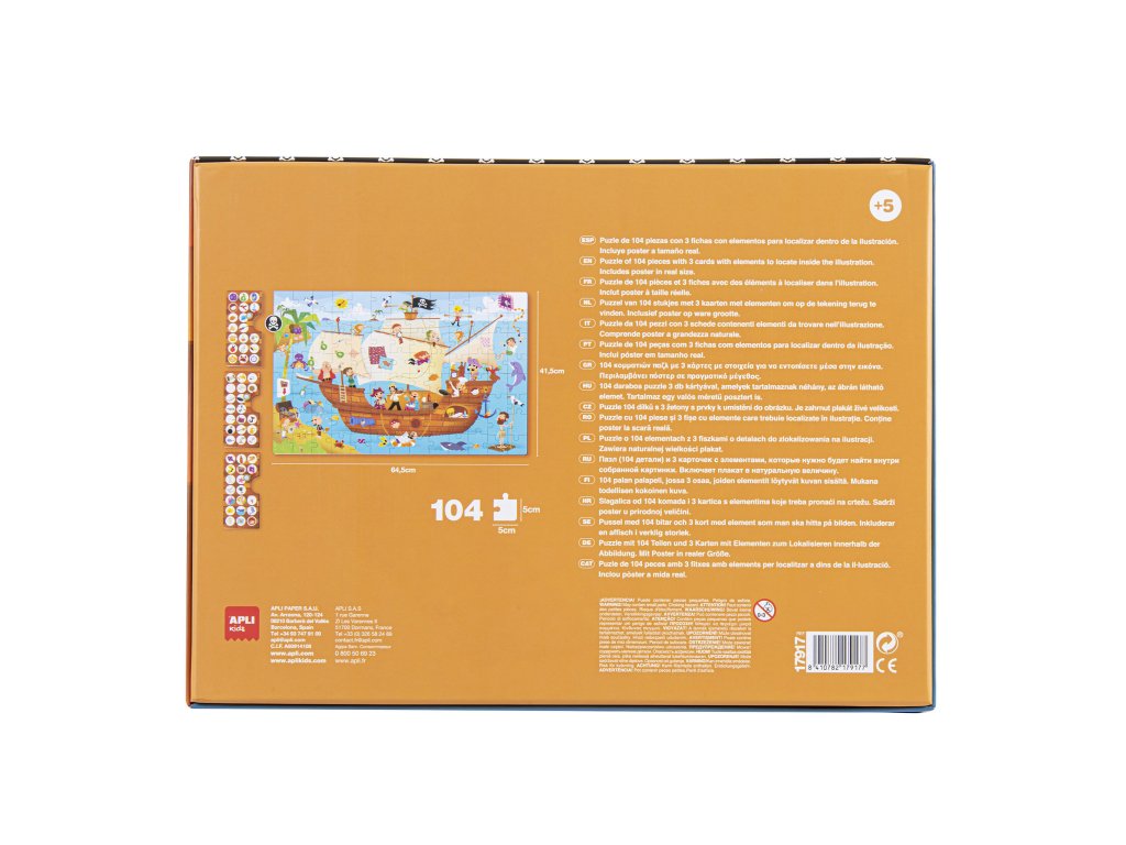 Postřehové puzzle s tématikou pirátské lodi. Obsahuje 104 kusů o velikosti 5 x 5 cm. Velikost puzzle: 64,5 x 41,5 cm.