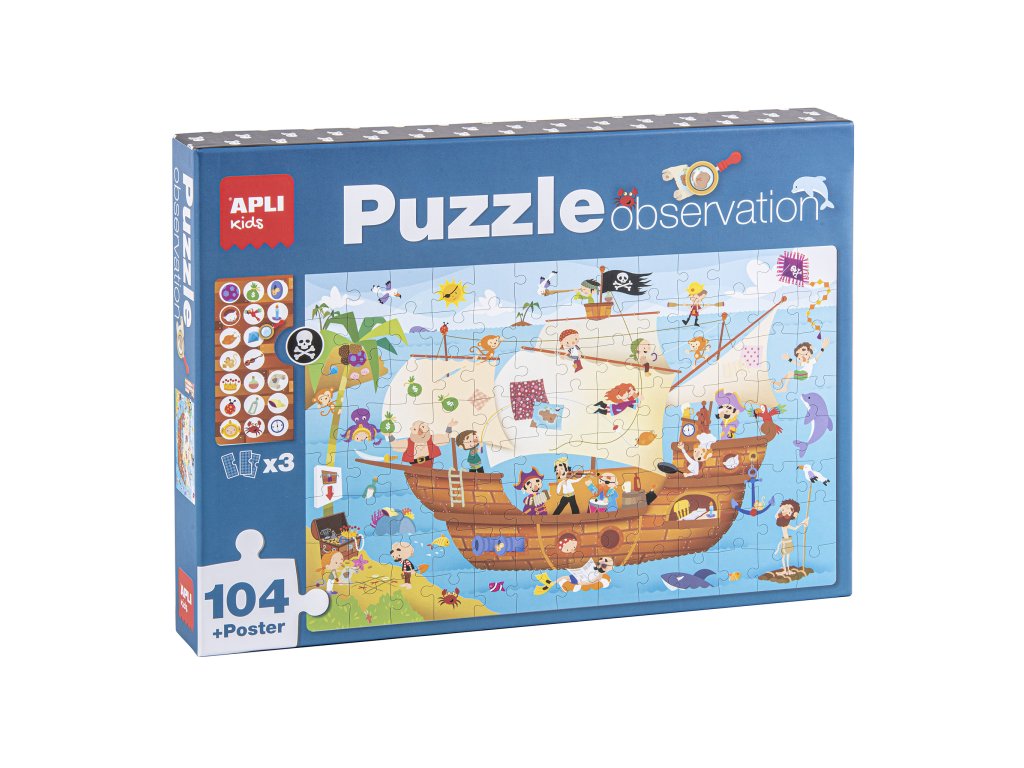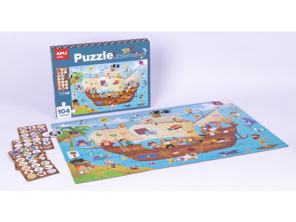 Vstupte s dětmi do kouzelného a tajemného světa pirátů a pirátských lodí. Užijte si dobrodružství mezi piráty při skládání puzzle. Nechte pak děti hledat detaily z žetonů v obrázku, co složily.