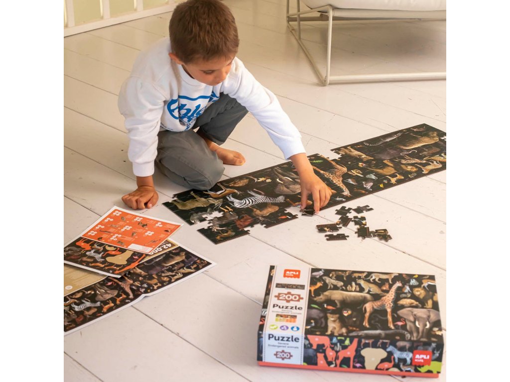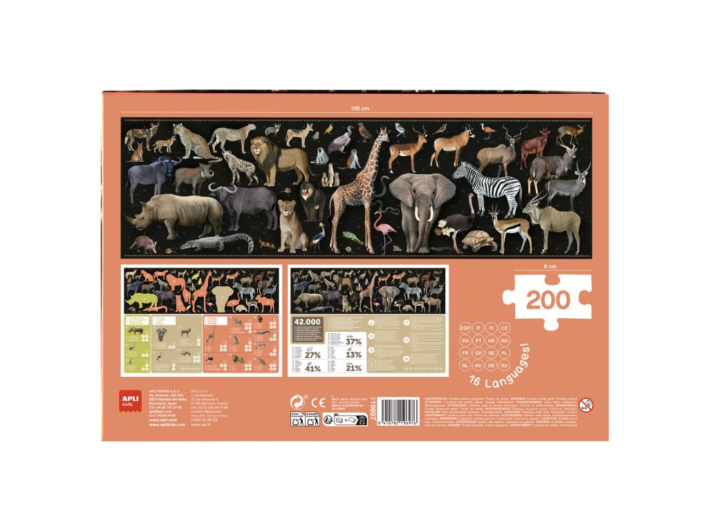 Obsahuje 200 dílků o velikosti 6 x 3 cm a 2 karty s informacemi o ohrožených druzích a důvodech jejich výskytu v 16 různých jazycích včetně českého jazyka.