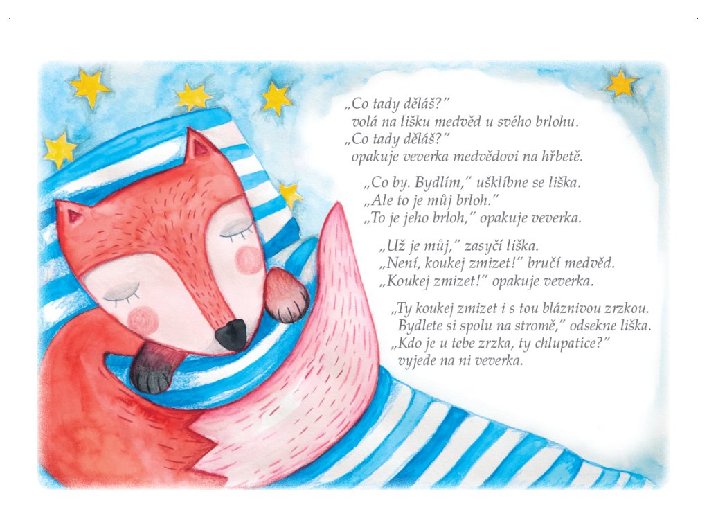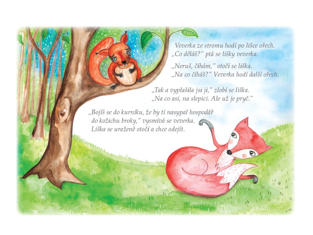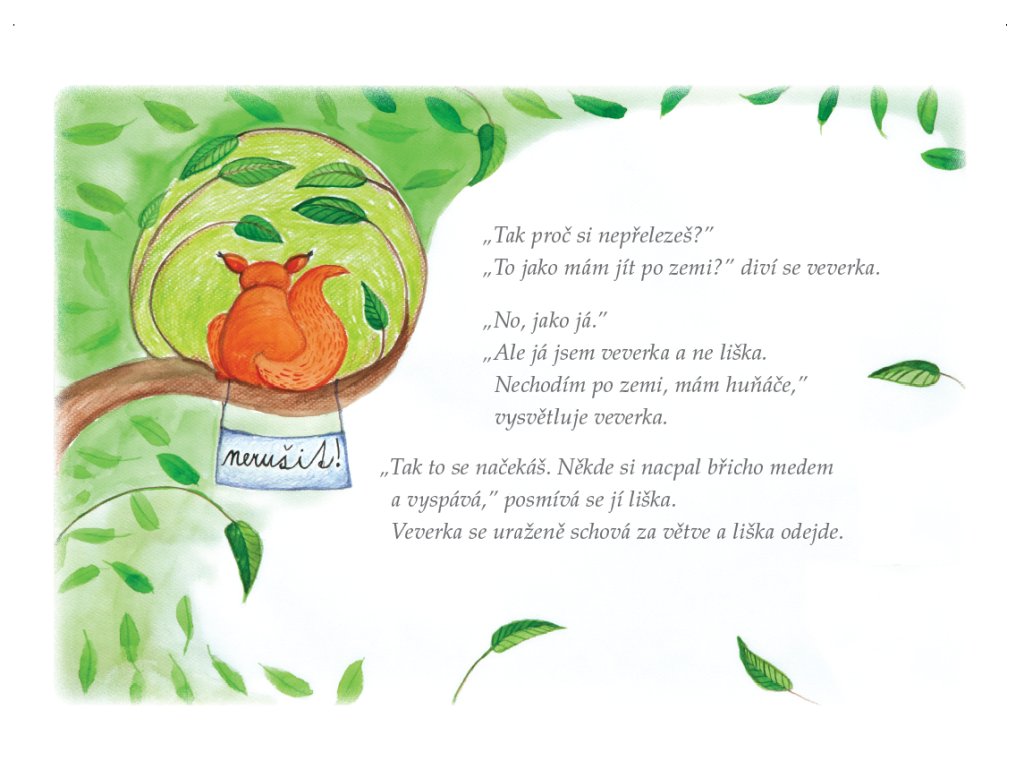 Byla jedna veverka, co neskákala ze stromu na strom a neběhala po zemi. Neuměla to. Měla kamaráda medvěda, který jí všude nosil. Jednoho dne však medvěd měl jinou práci a co chudák veverka? Naučila se chodit?