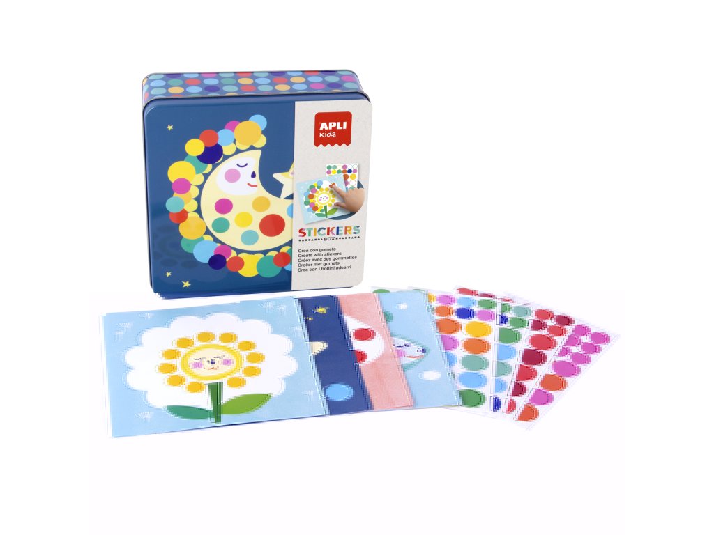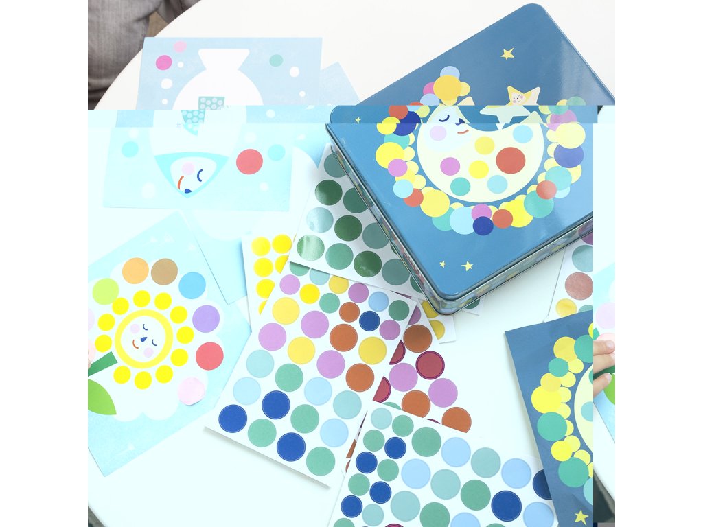 Sada obsahuje: 16 listů k vyplnění samolepkami (8 designů, 2 listy od každého designu), 12 listů odnímatelných kulatých samolepek v různých barvách a velikostech a průvodce s barevnými příklady.