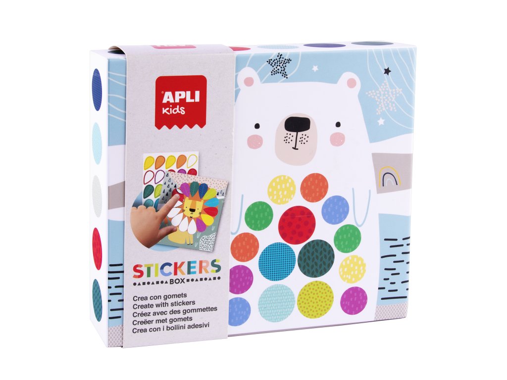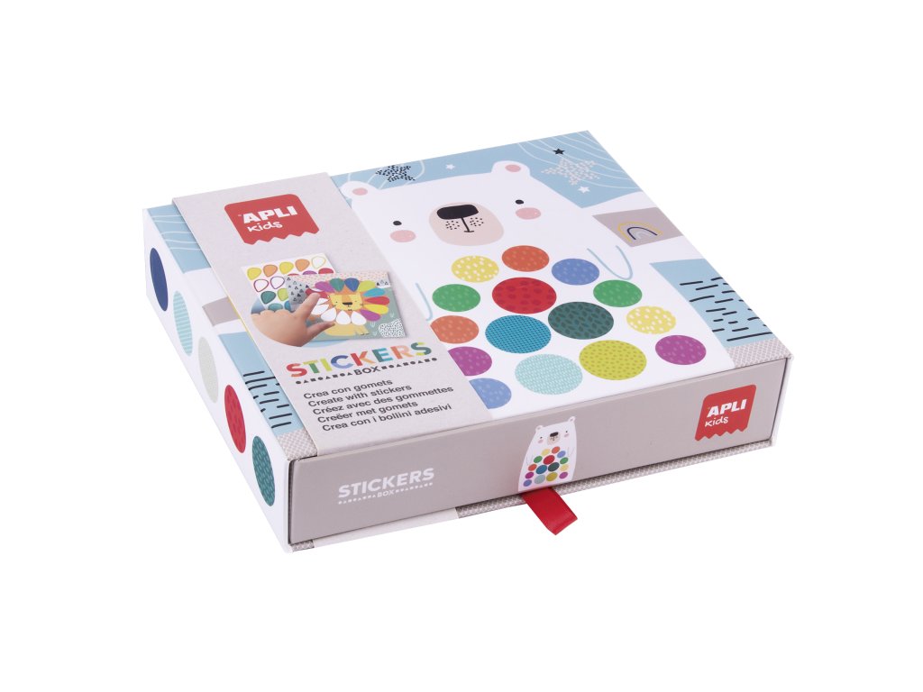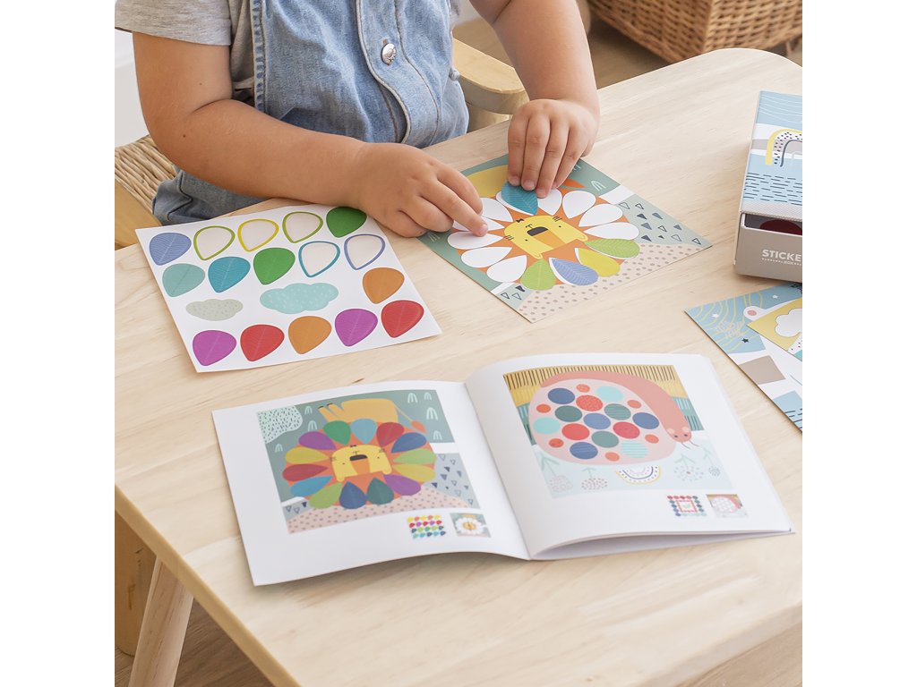 Sada obsahuje: 8 ilustrovaných archů k vyplnění samolepkami, 8 listů odnímatelných geometrických samolepek v různých barvách a průvodce s příklady barev.
