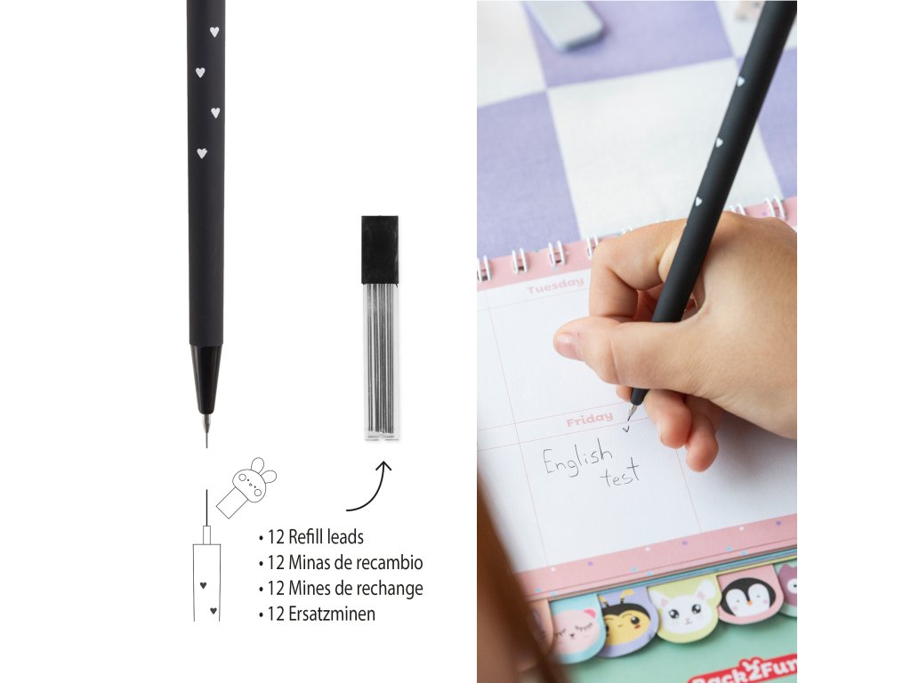 Obsah: 1 jednotka, s náplní 12 náplní v plastové krabičce. Mechanická tužka: Ø15 x 162 mm. Tuha: 2B černý 0,5 mm.
